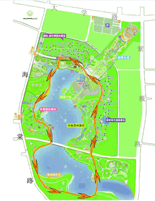 本次大賽舉辦地濟南國際園博園是目前國內(nèi)陸地面積最大的園博園。園內(nèi)展園總數(shù)超過一百個,包括17個省內(nèi)城市、45個其他城市、我國港澳臺地區(qū)以及21個國外城市的主題園區(qū)。大賽分為專業(yè)組和業(yè)余組,專業(yè)組男、女各取前十名進行獎勵,業(yè)余組男、女各取前20名進行獎勵。參賽者們將在園博園環(huán)繞長清湖奔跑,專業(yè)組15公里,業(yè)余組7.5公里。